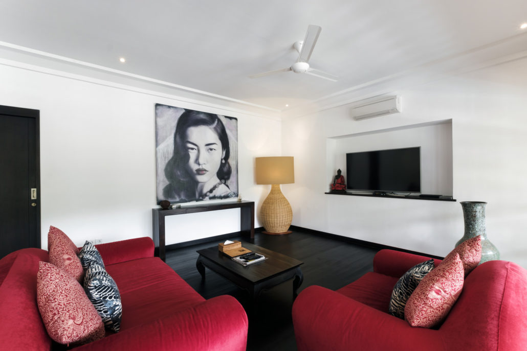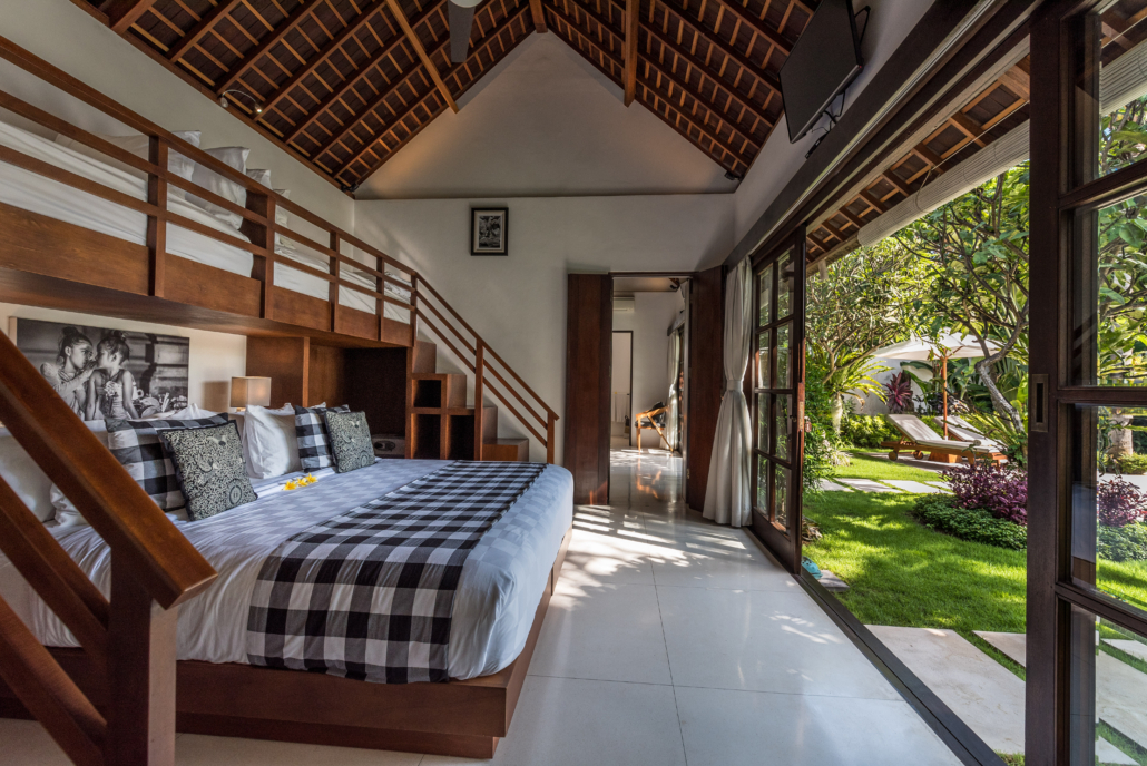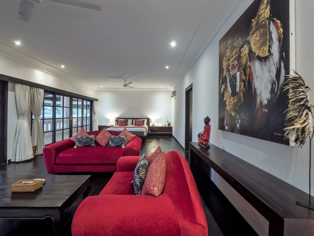 Villa Tjitrap has 6 luxury bedrooms. Four double bedrooms, that can also be set up as two singles, are located on the ground- and first floor of the main building. Two bedrooms are located in a separate pavilion with interconnecting doors, making it perfect for families. In fact, one of the bedrooms in the guest house features a king-sized bed on ground level and two single beds on a mezzanine for the kids. All six air-conditioned bedrooms are furnished with comfortable high-quality king-sized beds, a TV, elegant wardrobe closets and private en-suites with bathtubs.